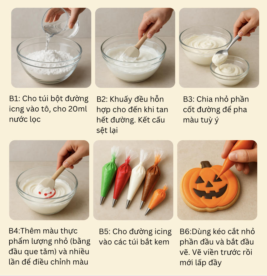 Tip thêm: Nếu muốn bánh bóng đẹp hơn, bạn có thể thêm 1–2 giọt nước chanh khi pha icing để tạo độ bóng tự nhiên.