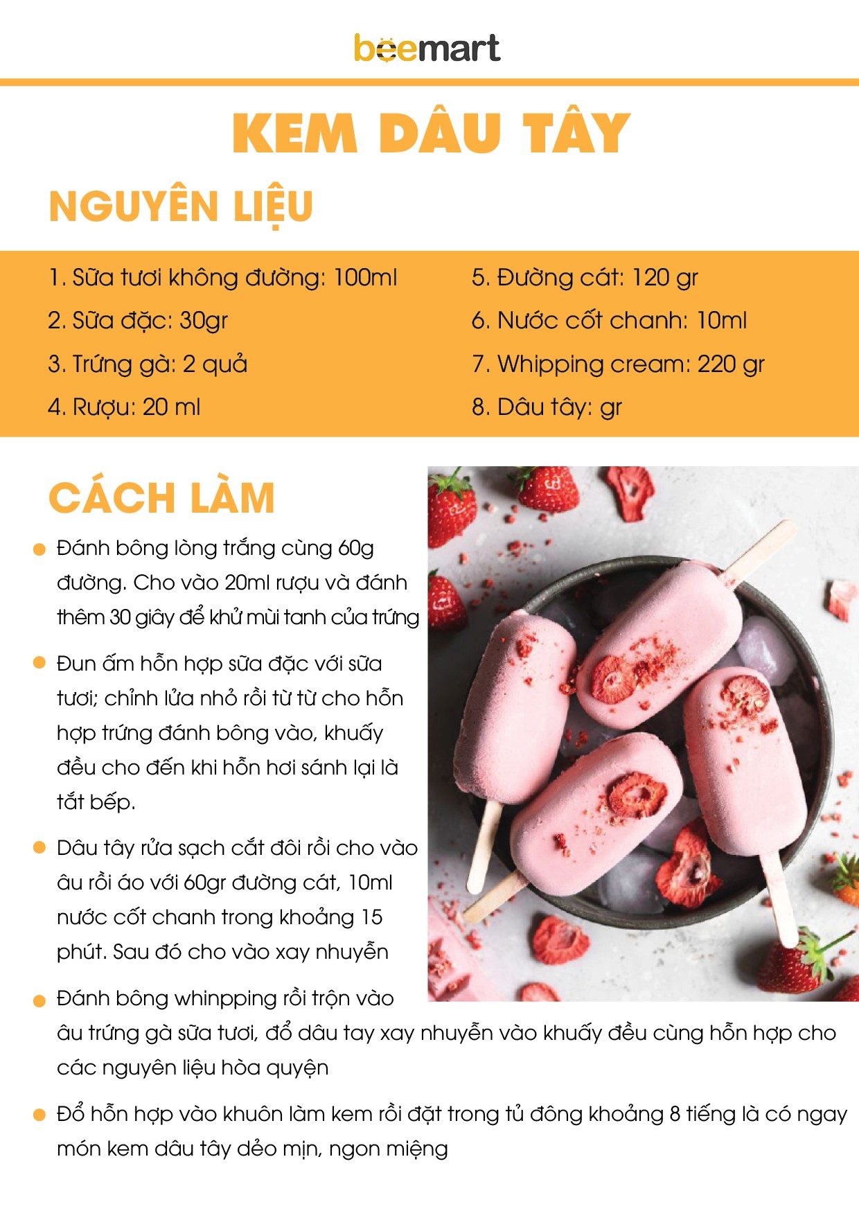 Mùa hè nắng nóng chắc ai cũng phải "tan chảy" trước những que kem mát lạnh. Vậy thì hãy tự làm những que kem hoa quả để "bái bai" cái nóng nha. Dưới đây là cách làm kem dâu tây Bee gợi ý bạn, bạn có thể thay dâu tây bằng hoa quả bạn thích nhé!!