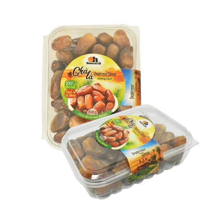 - Chà là khô không cành 500g Smile được thiết kế với hộp nhựa cứng trong suốt, giúp khách hàng dễ dàng thấy sản phẩm bên trong. Với thiết kế tinh tế cùng sản phẩm chất lượng sẽ là lựa chọn tốt dùng biếu, tặng gia đình, bạn bè, đối tác.