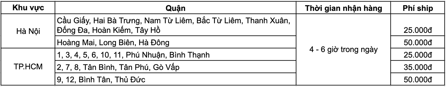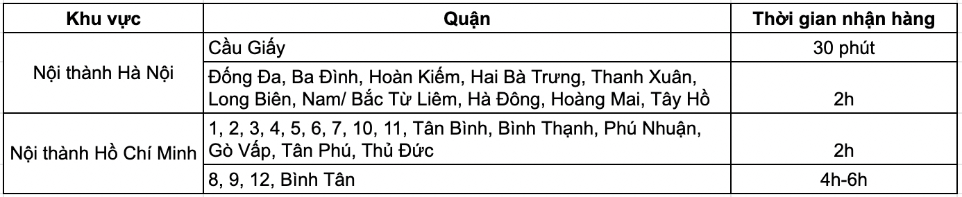 - Dịch vụ áp dụng cho toàn bộ các quận tại Hà Nội và TP.HCM. Thời gian giao hàng chi tiết các khu vực như sau: