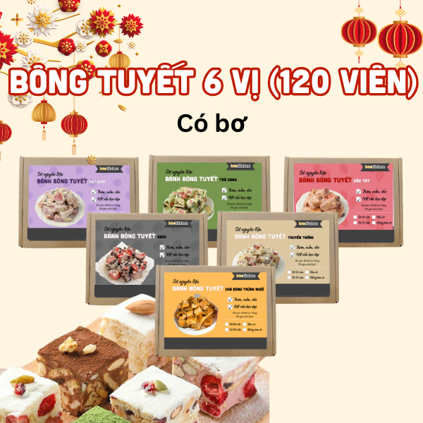 - 1 Set bánh bông tuyết truyền thống- Thành phẩm: 20 viên (~350g). Gồm: Marshmallow ít ngọt, sữa bột tách béo, bơ nhạt, bánh quy mặn, hạt mix, quả khô, găng tay, giấy nến, túi đựng bánh, tờ hướng dẫn công thức.