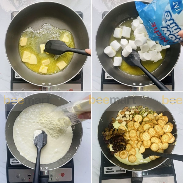 - Đổ lần lượt bánh quy mặn, hạt mix và quả khô vào chảo. Trộn đều sao cho hỗn hợp kẹo dính đều lên phần nguyên liệu khô vừa thêm vào, tạo thành một khối thống nhất thì dừng lại (ở bước này bạn có thể dùng găng tay để trộn đều hỗn hợp).