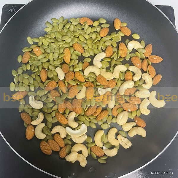 - Đổ hạt mix ra khay nướng đem nướng trong lò ở nhiệt độ 150 độ C trong khoảng 10-15 phút