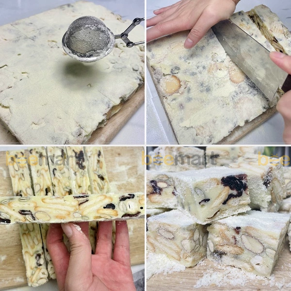 Bánh Bông Tuyết là biến tấu của kẹo Nougat với sự kết hợp của lớp Nougat dai dai, cốt bánh quy mặn xôm xốp điểm vị rất hài hòa, xen lẫn thêm chút hạt bùi bùi béo ngậy, mứt trái cây sấy lạnh chua ngọt tự nhiên phủ lên bề mặt bánh, làm đậm đà hơn cho lớp nền ngọt thơm. Ít đường, không quá ngọt, lạ miệng và đặc biệt không có chất bảo quản, chiếc bánh này sẽ được lũ trẻ thích mê. Hãy cùng Bee bắt tay làm món bánh này nhé.