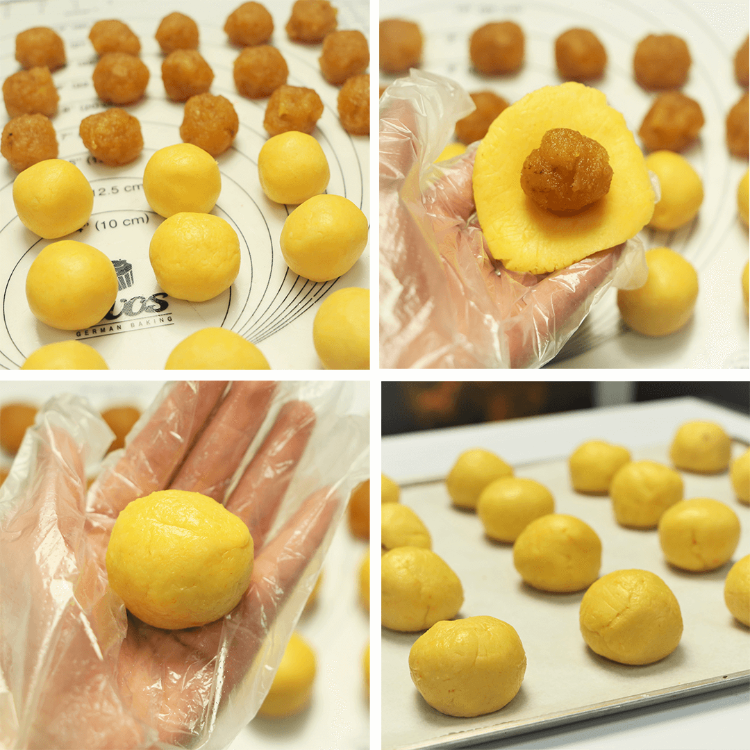 Ấn dẹt viên bột vỏ rồi đặt viên nhân vào giữa, bao kín nhân rồi vê tròn đặt lên khay nướng đã lót giấy nến