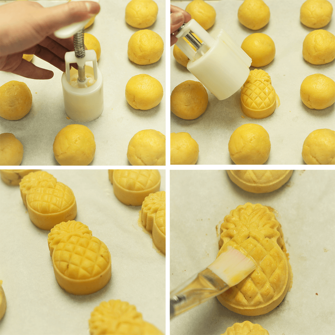 Sử dụng khuôn tạo hình bánh dứa lò xo, 1 tay giữ chặt bầu khuôn, 1 tay dùng lực ấn khuôn từ trên xuống để ấn tạo hình cho bột