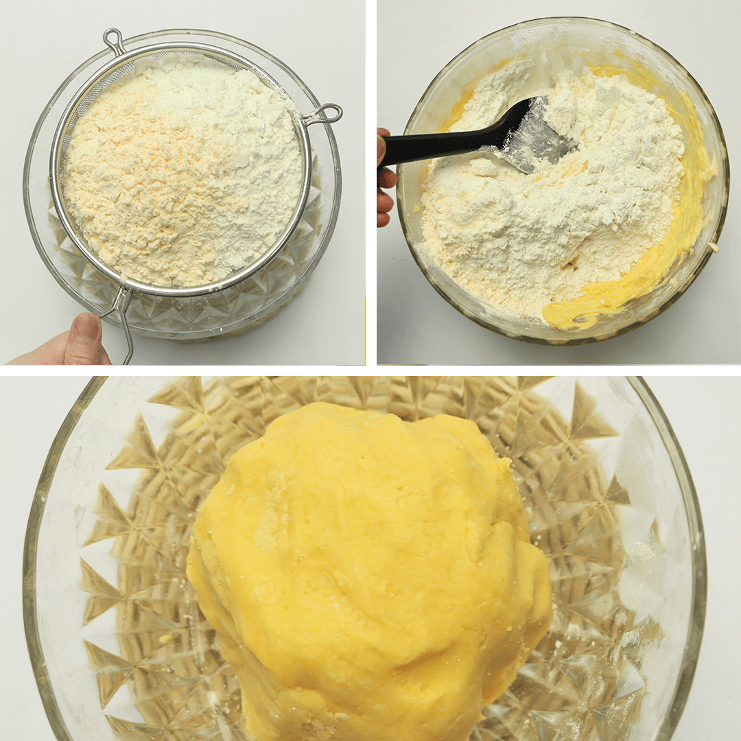 Chia làm 2 lần rây và trộn đều bằng spatula sao cho tạo thành 1 khối mềm mịn