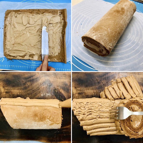 - Lấy phần kem whipping cò lại phết đều lên bề mặt bánh để nối các khúc cây lại với nhau. Cho nốt phền kem whip còn lại phủ lên mặt bánh, dùng dao chà láng hoặc lá bài phết kem lên cho bề mặt phẳng hơn sau đó sử dụng nĩa để tạo các đường vân của khúc cây. Cách trang trí này khá là nhanh không cần quá cầu kì vì đường vân hơi ẩu một chút sẽ càng tự nhiên hơn.