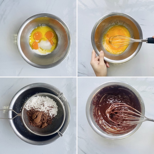 Lưu ý: đánh đến khi nào bột mì, bột cacao tan hết và hỗn hợp đều màu, không lợn cợn là được.