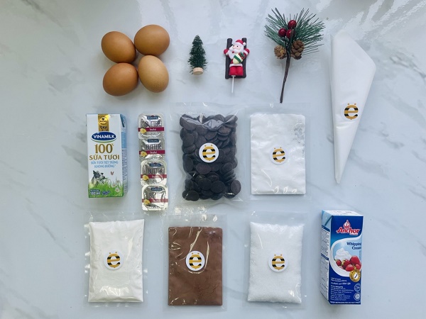 -Bột số 8: 60g; bột cacao: 20g; Sữa tươi không đường: 40g; Đường trắng: 70g; bơ: 32g; socola 55%: 150g; whipping cream 250g; đường bột: 20g; bột vani 1ống; túi bắt kem: 10 chiếc; Đồ trang trí noel