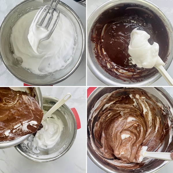 - Múc 1 phần lòng trắng vừa đánh vào âu hỗn hợp bột ở bước 1, dùng phới trộn đều từ dưới lên trên.