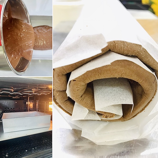 - Bánh chín, lấy bánh ra khỏi khuôn. Khi bánh còn ấm dùng 1 tấm giấy nến khác lót bên dưới bánh, cuộn theo chiều dài của bánh lại, đem cất trong ngăn mát tủ lạnh khoảng 30 phút.