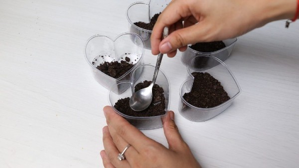 - Mỗi một hộp bánh hình tim bạn sẽ cần 10g bánh Oreo để phủ kín lớp đáy, một cách nhanh chóng hơn là các bạn sử dụng 2 muỗng pha cà phê để đo lượng bánh Oreo vào hộp nhựa tim đáng yêu. Đồng thời cũng chính sử dụng chiếc muỗng đó, nén bánh sao cho có sự liên kết nhưng không cần chặt quá. Mỗi một lớp bánh Oreo sẽ cần 2 muỗng syrup cà phê tương ứng với 10ml syrup cà phê, các bạn chỉ cần lắc nhẹ, cà phê sẽ nhanh chóng thấm xuống lớp bánh.