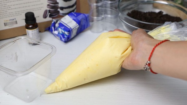 - Cắt đầu túi bắt bông kem và cho kem trên phần bánh Oreo, các bạn sẽ lặp đi lặp lại quá trình trên đến khi bánh đầy hộp nhựa. Với hộp nhựa chúng mình gợi ý bạn có thể làm được 2 lớp mỗi lớp cơ bản có bánh Oreo, syrup cà phê, kem tiramisu. Sau khi xong bánh, các bạn sẽ chuyển qua phần trang trí bánh nhé!