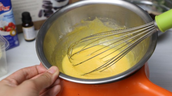 - Tiếp tục chúng ta sẽ đến phần kem, bạn cần tách 3 lòng đỏ trứng vào trong một chiếc âu, sử dụng phới lồng đánh bông lòng đỏ đến khi trứng chuyển màu, có những bọt khí li ti thì thêm 40g đường xay. Bắc âu lên nồi nước đun nhỏ lửa, đặc biệt không được để đáy âu chạm vào nước, tiếp tục khuấy từ 42-45 độ C đến khi trứng có sệt vừa phải, chuyển hẳn sang màu vàng nhạt thì bạn tắt bếp, bắc âu ra nồi.