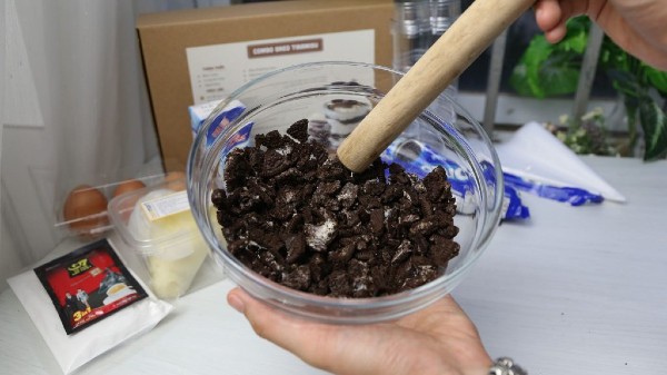 - Đầu tiên, các bạn sẽ bắt tay vào làm phần bánh Oreo trước. Cho toàn bộ bánh Oreo vào túi bắt bông kem cỡ lớn, dùng cán bột để đập vụn bánh. Trong các công thức trên thị trường, các bạn thường thấy sẽ bỏ lớp kem của bánh thay bằng bơ đun chảy để liên kết các vụn bánh với nhau. Tuy nhiên, các bạn nên để nguyên lớp kem để bánh sẽ có kết cấu đủ chặt không bị quá cứng như với bơ đồng thời vị bánh cũng sẽ hài hòa hơn. Bánh đập vụn to sẽ làm bánh có độ giòn hơn so với vụn nhỏ đấy nha!