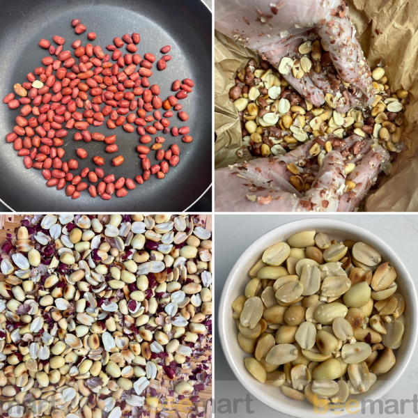 - Sau khi đậu phộng đã nguội, chà sát nhẹ để tách vỏ, sau đó đem sàng cho bay hết vỏ và chỉ giữ lại phần nhân trắng.