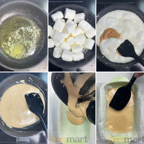 - Sau khi bơ tan, đổ 120g marshmallow vào chảo, hạ bếp xuống mức thấp nhất, đảo đều tới khi marshmallow tan hết thì tắt bếp cho 30g bơ đậu phộng vào đảo đều tới khi quyện hoàn toàn.