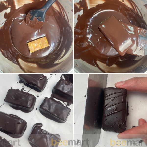 - Nhúng kẹo vào socola để phần kẹo được bao phủ toàn bộ bởi socola.