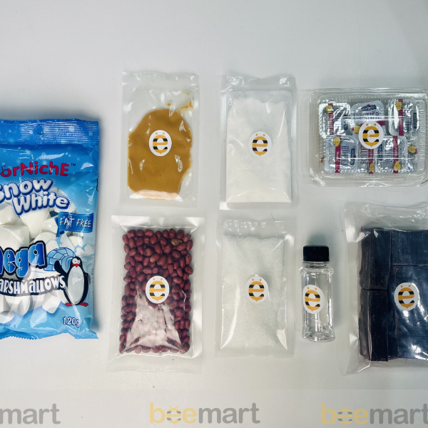 Marshmallow 120g - Bơ 56g - Bơ đậu phộng mịn 30g - Đường kính 30g - Mật ngô 50g - Bột whipping cream 20g - Đậu phộng 100g - Socola đen 300g