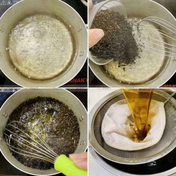 Đun sôi 1 lít nước đến khi sôi, cho 25g trà vào đảo nhẹ cho trà ngập sau đó tắt bếp đậy vung kín, để nguyên trên bếp ủ trà trong vòng 14 phút. Lọc trà qua ray hoặc vợt vải lọc trà sao cho lấy hết được hết phần nước trà và phần bã trà.