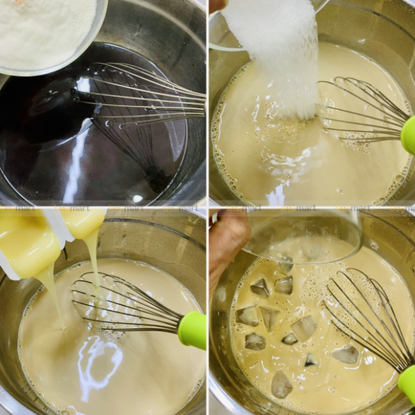 Tiếp tục đổ 500g đá lạnh vào khuấy đều cho hỗn hợp trà sữa giảm nhiệt độ rồi đem cất tủ mát khoảng 1 giờ