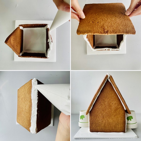 - Bơm đường icing lên phần đỉnh của khung nhà sau đó đặt từng tấm mái nhà lên dính liền với phần khung