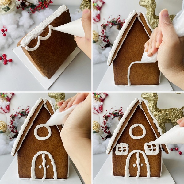 - Cuối cùng sau khi đợi phần icing trên bánh khô bớt, chúng ta sẽ bơm thêm đường icing lên các đường viền của ngôi nhà để tạo cảm giác tuyết đóng băng và rắc đường bột để tạo cho ngôi nhà có 1 lớp tuyết bao phủ