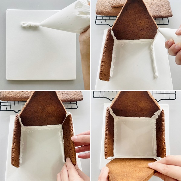 - Đặt các phần mặt nhà và hông nhà lên và kết dính các điểm nối nhau của ngôi nhà bằng đường icing
