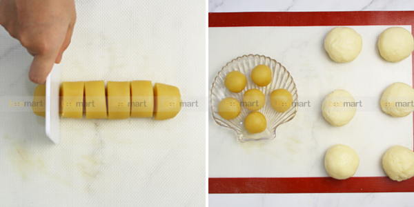 Bạn chia 180g nhân chanh dây thành 6 phần bằng nhau (mỗi phần 30g) và vỏ bánh cũng thành 6 phần bằng nhau rồi vo tròn lại.