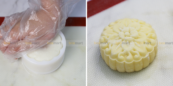 Đặt bánh vào khuôn, nhấn và giữ chặt khuôn trong khoảng 10 giây rồi gỡ khuôn là bánh đã hoàn thành. Cứ làm như vậy với những phần bánh còn lại.