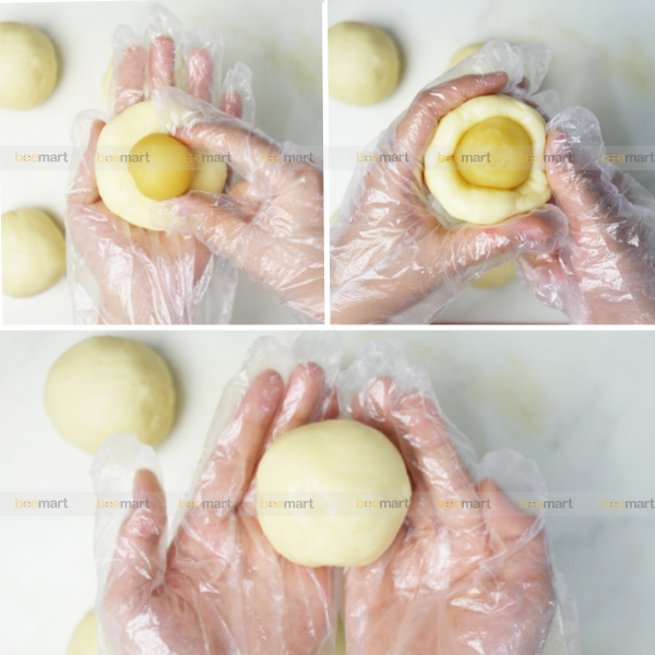Lấy 1 phần vỏ bánh nhấn dẹt ra rồi đặt phần nhân vào giữa. Vừa vo tròn vừa miết nhẹ sao cho vỏ phủ kín phần nhân. Làm tương tự lần lượt đến khi hết nguyên liệu.