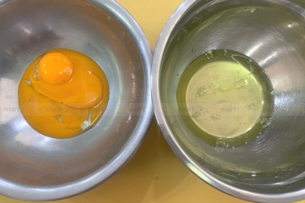 - Đầu tiên trứng gà bạn để ở nhiệt độ phòng, tách riêng lòng đỏ và lòng trắng trứng ra 2 tô khác nhau.