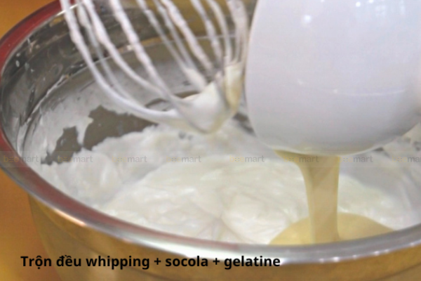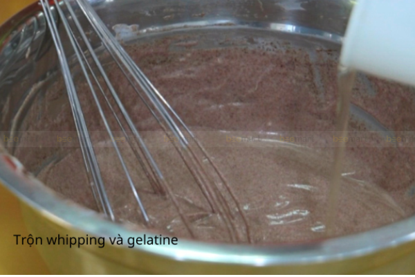 - Trộn 250 whipping với 80g socola đã đun chảy, cho thêm gelatine vào và khuấy đều.