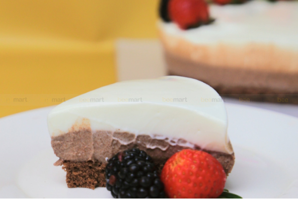 - Cuối cùng nhẹ nhàng gỡ khuôn bánh ra là đã hoàn thành chiếc bánh mousse chocolate 3 tầng rồi. Bạn có thể trang trí thêm hoa quả tươi cho bánh theo ý thích nhé!
