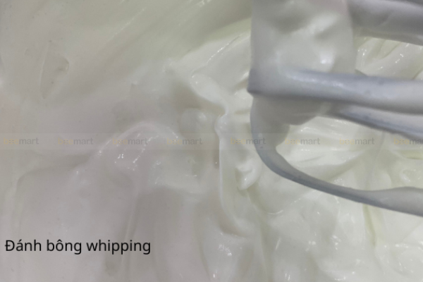 Lưu ý: Chỉ cần đánh bông mềm, không cần đánh bông cứng. Tức là whipping cream sẽ đặc lại so với ban đầu, giơ que đánh trứng lên kem không tạo thành chóp là đạt.