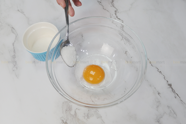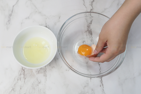 - Sau khi chuẩn bị đầy đủ nguyên liệu bạn tách lấy lòng đỏ trứng gà. Thêm 1/2 lượng đường đã chuẩn bị vào tô lòng đỏ.
