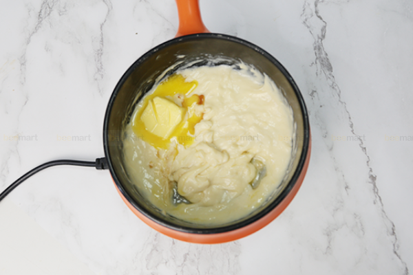 - Để bếp ở lửa vừa, khuấy đều hỗn hợp đến khi sệt lại thì tắt bếp