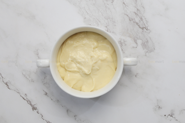 - Nhanh tay đổ hỗn hợp kem trứng ra bát và chờ hỗn hợp nguội, trong thời gian đó sẽ đi đánh bông kem tươi