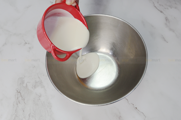- Đánh bông kem tươi đã để lạnh cùng phần đường còn lại.