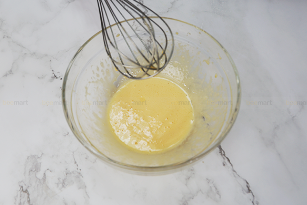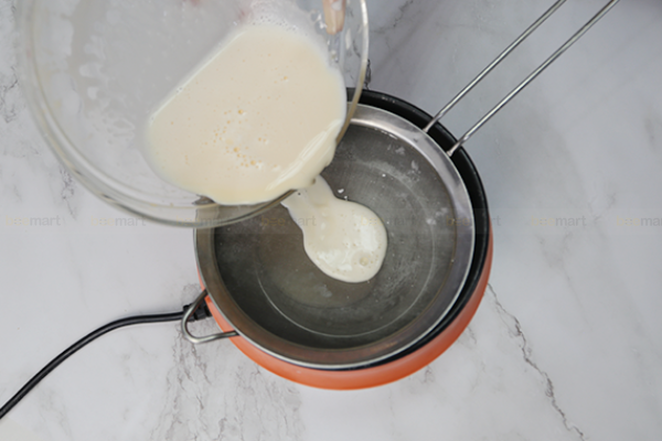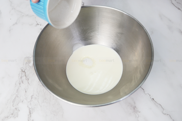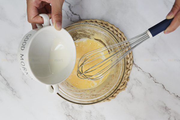 - Sau khi bột ngô tan hết bạn thêm 100ml sữa tươi vào tô lòng đỏ, khuấy đều cho các nguyên liệu hòa quyện với nhau