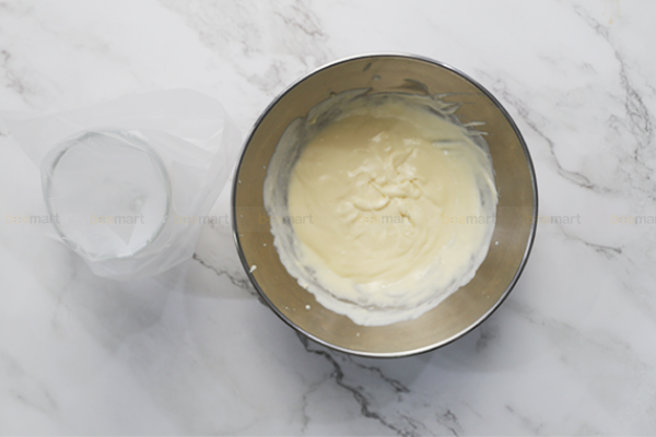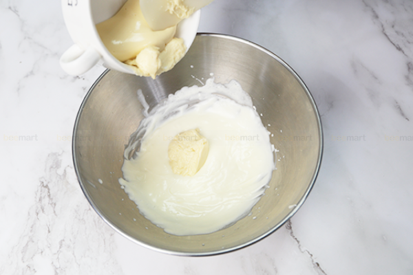 Lưu ý: Nếu đánh xong kem tươi mà kem trứng vẫn chưa nguội thì bỏ kem tươi vào ngăn mát tủ lạnh để kem không bị chảy nhé!