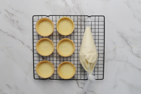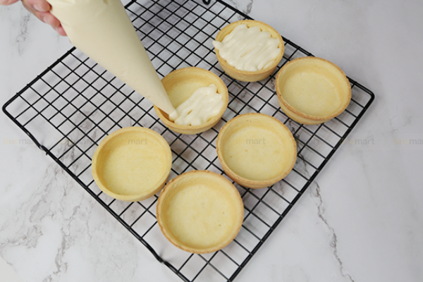 - Cắt một lỗ nhỏ ở đầu túi bắt kem rồi bắt đầu bơm nhân vào đế bánh tart