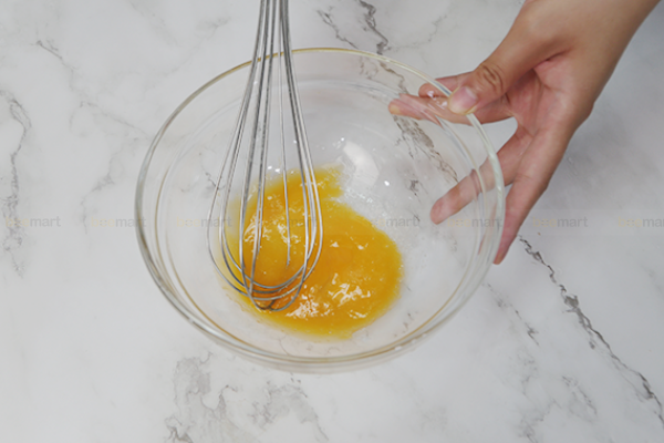 - Dùng phới lồng đánh đến khi trứng gà chuyển sang màu vàng nhạt thì dừng lại