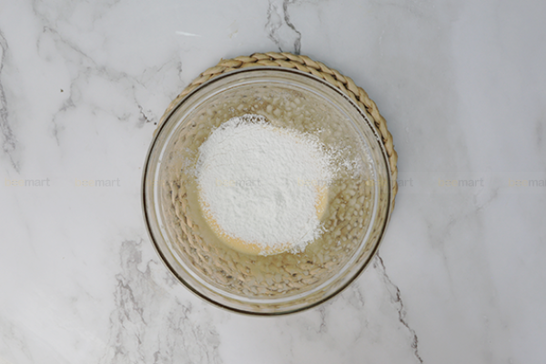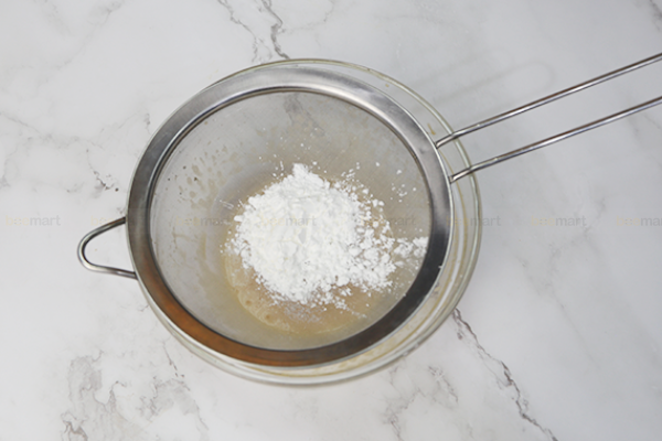 - Rây 10g bột ngô vào tô lòng đỏ, trộn đều đến khi tan hết bột ngô