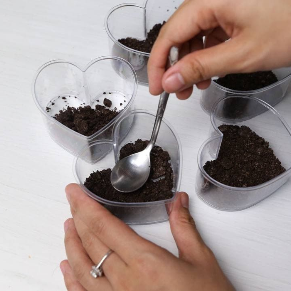 Mỗi một hộp bánh hình tim bạn sẽ cần 10g bánh Oreo để phủ kín lớp đáy, một cách nhanh chóng hơn là các bạn sử dụng 2 muỗng pha cà phê để đo lượng bánh Oreo vào hộp nhựa tim đáng yêu. Đồng thời cũng chính sử dụng chiếc muỗng đó, nén bánh sao cho có sự liên kết nhưng không cần chặt quá. Mỗi một lớp bánh Oreo sẽ cần 2 muỗng syrup cà phê tương ứng với 10ml syrup cà phê, các bạn chỉ cần lắc nhẹ, cà phê sẽ nhanh chóng thấm xuống lớp bánh.