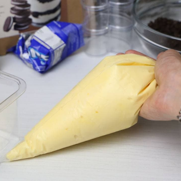 Cắt đầu túi bắt bông kem và cho kem trên phần bánh Oreo, các bạn sẽ lặp đi lặp lại quá trình trên đến khi bánh đầy hộp nhựa. Với hộp nhựa chúng mình gợi ý bạn có thể làm được 2 lớp mỗi lớp cơ bản có bánh Oreo, syrup cà phê, kem tiramisu. Sau khi xong bánh, các bạn sẽ chuyển qua phần trang trí bánh nhé!