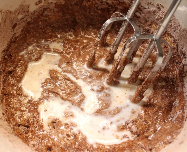 Bước 3: Hỗn hợp sữa và giấm bạn chia làm 2 phần, và cho xem kẽ với mỗi lần trộn bột để hỗn hợp không bị khô và khó trộn. Cứ 1 lần rây bột, sau đó cho 1 phần sữa, và kết thúc là một phần bột.