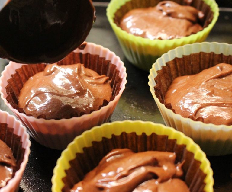 Bước 5: Sau đó thì ngay lập tức cho vào khuôn và đem nướng ở nhiệt độ 175 độ C ! Nên làm nóng lò nướng trước nhé! Nướng bánh trong vòng 20 – 25 phút, kiểm tra bánh bằng cách dùng tăm xiên vào tâm bánh, rút tăm ra nếu tăm khô ráo là chín. Để lên rack chờ bánh nguội.