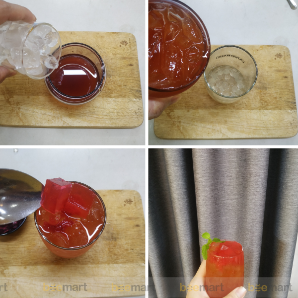 - Cho trân châu dưới đáy cốc, tiếp đó đổ trà dâu vào, và thêm một chút thạch dâu trên bề mặt bạn đã hoàn thành.
